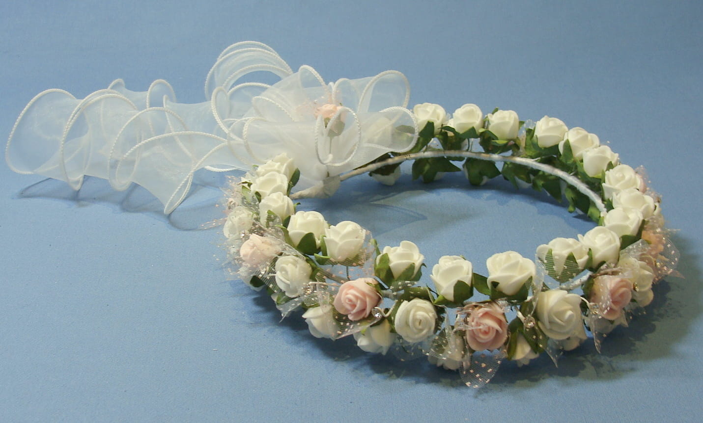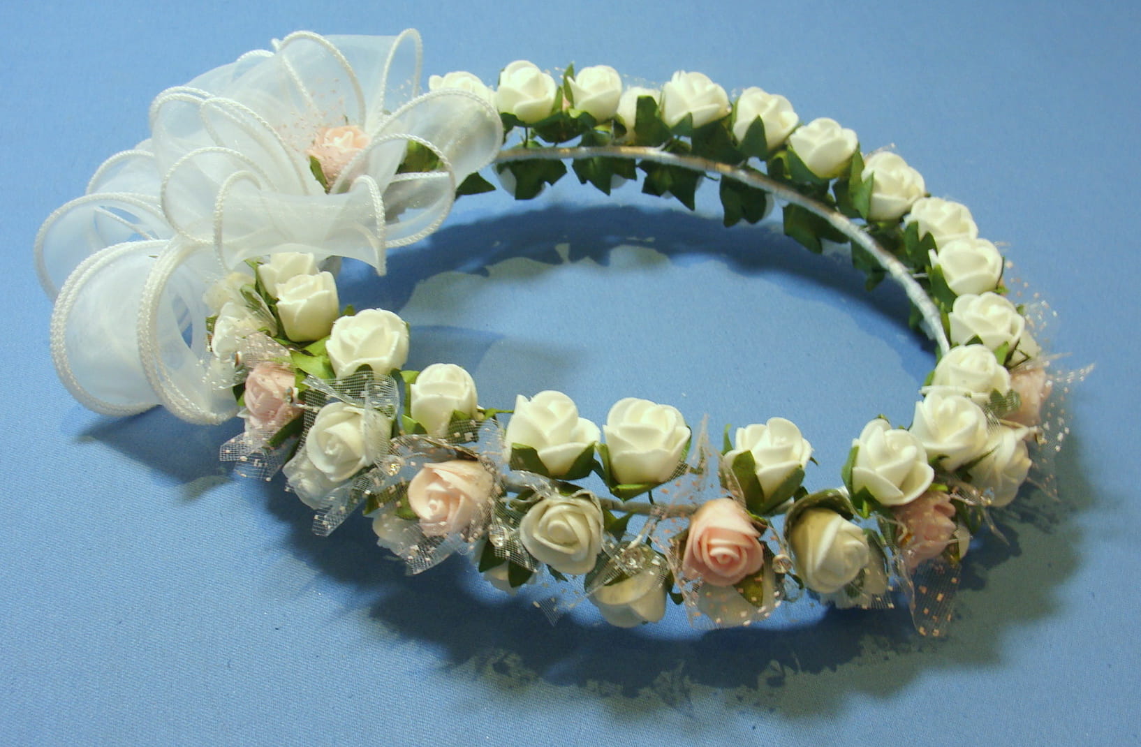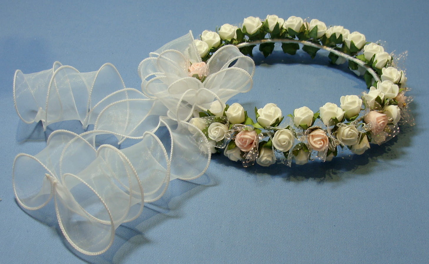 Tył wianka stanowi biała , atłasowa kokarda , atłasowe tasiemki, perełki nanizane na sznureczek i komponująca się z całym wiankiem różyczka.