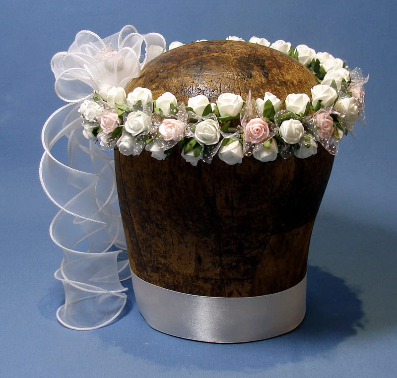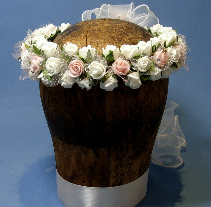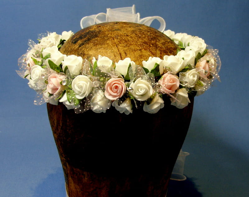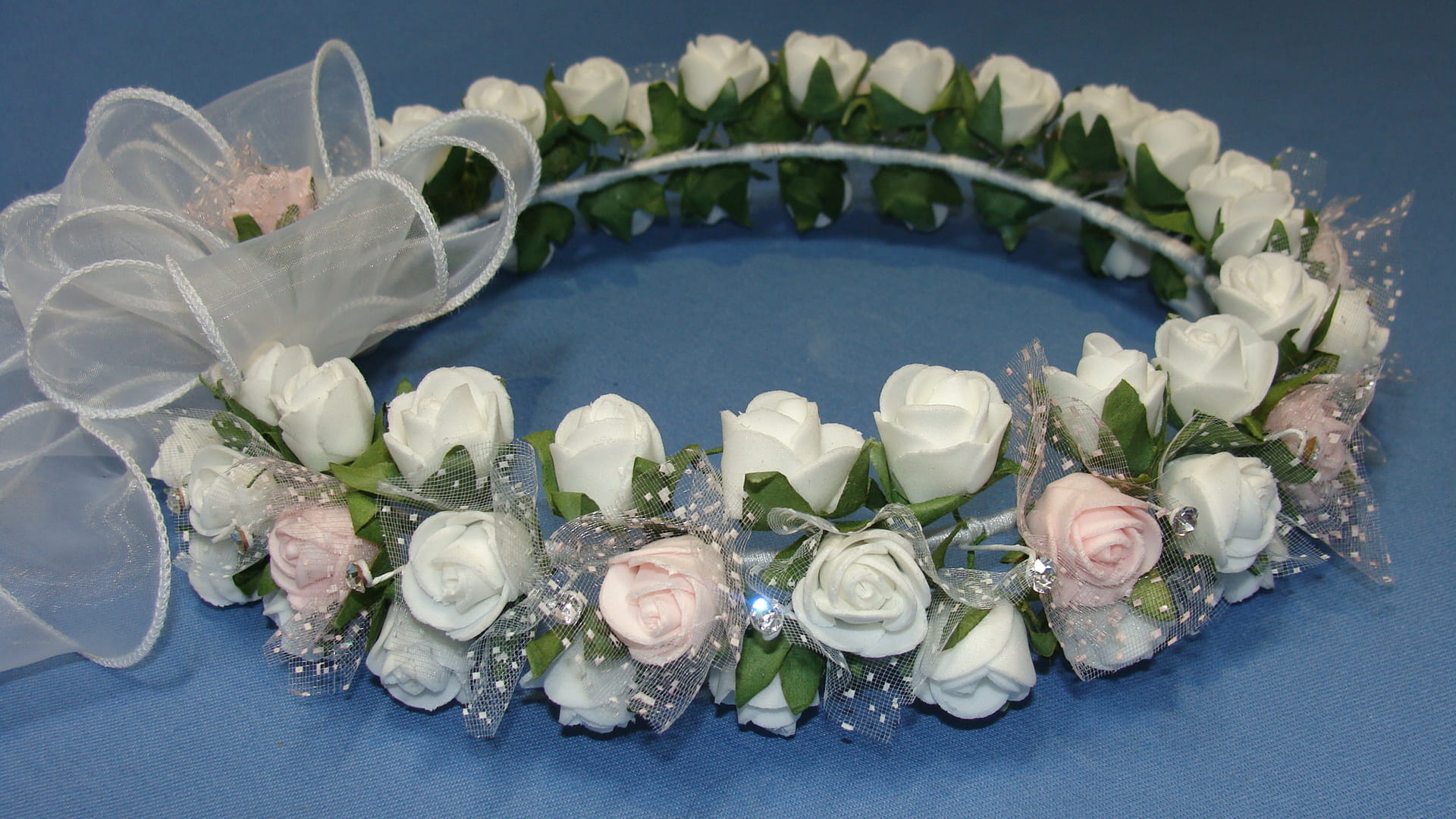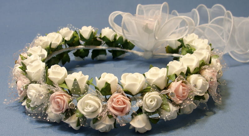 Tył wianka stanowi biała , atłasowa kokarda , atłasowe tasiemki, perełki nanizane na sznureczek i komponująca się z całym wiankiem różyczka.