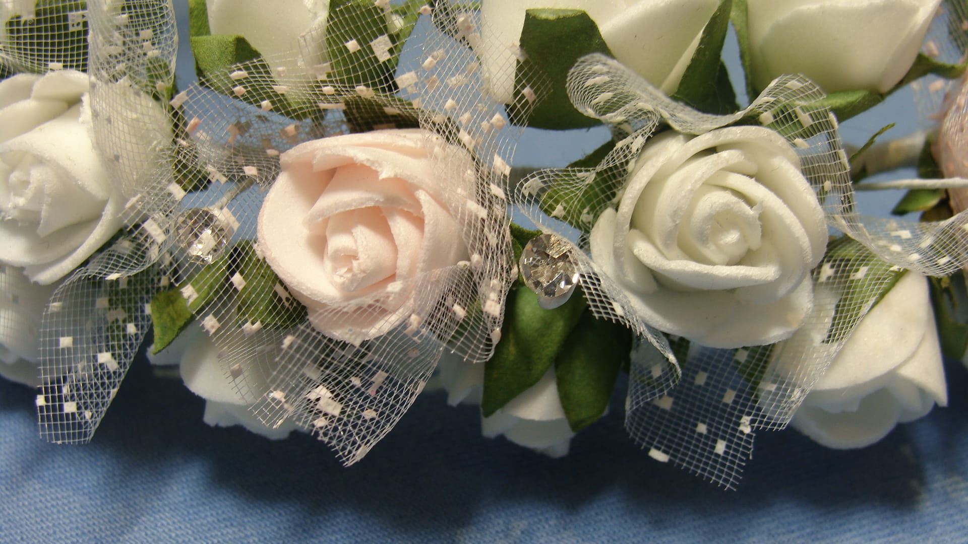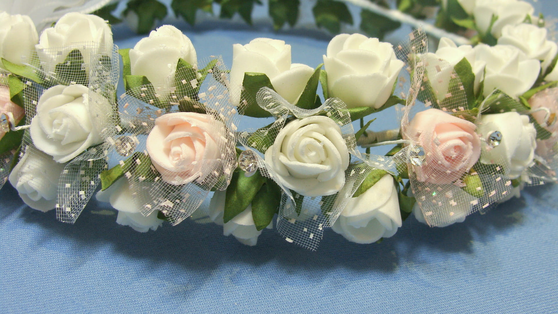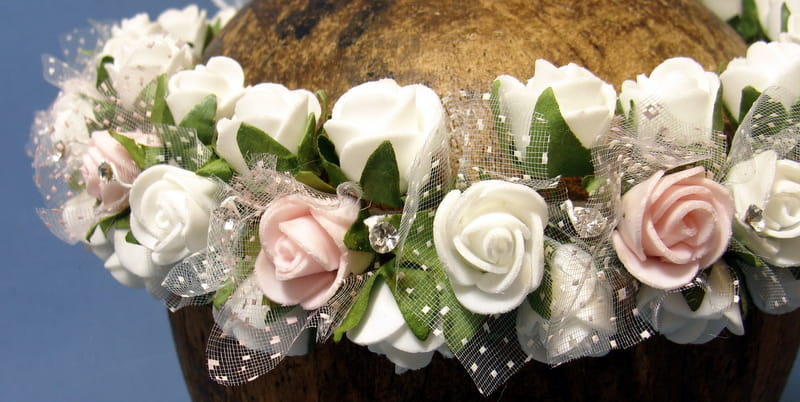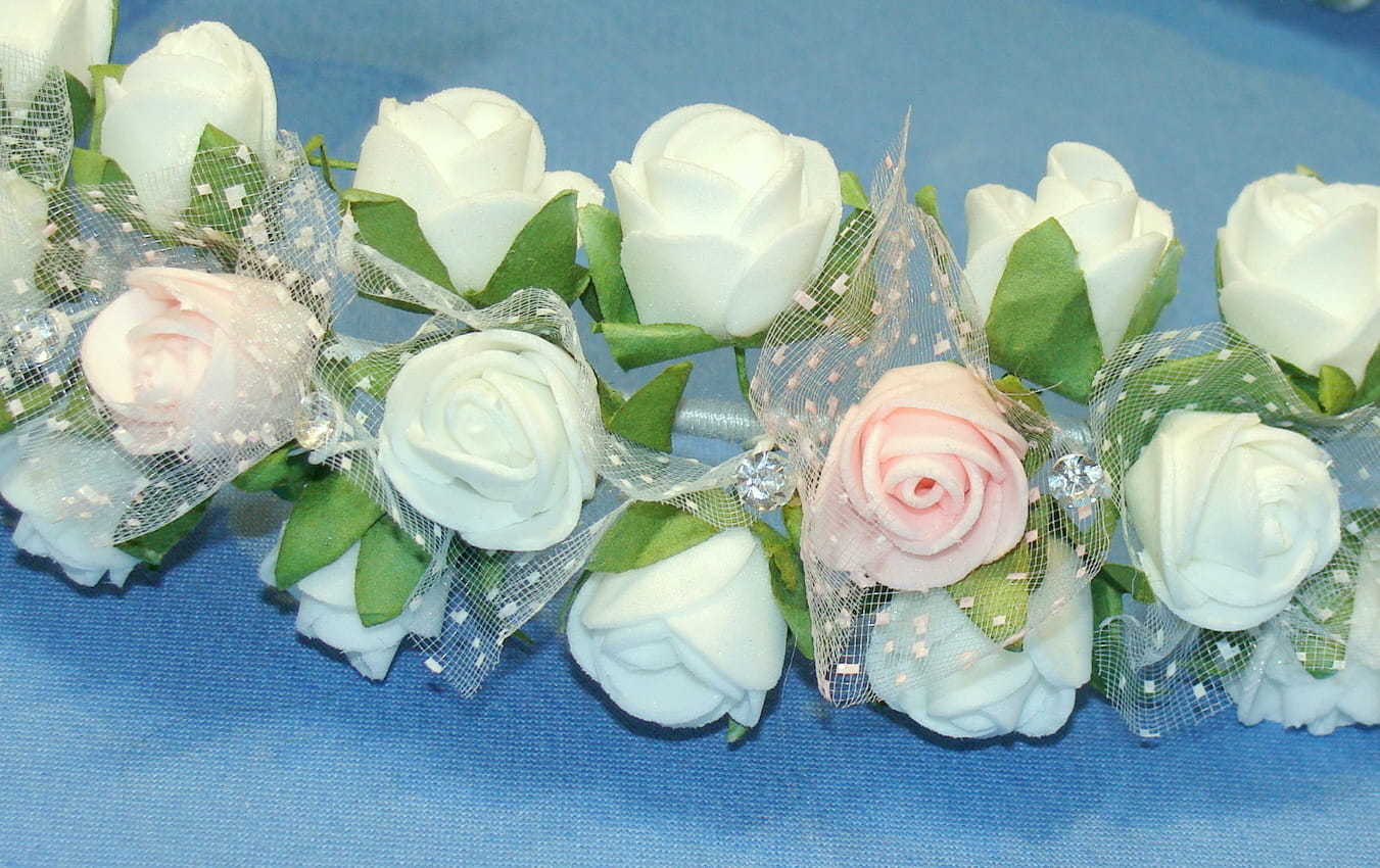 Wianek Clarisse skomponowana jest z 3 rodzajów różyczek. Środkowy rząd różyczek różowych i białych otoczony jest okółkami z tiulu z kropeczkami. Spod każdej różyczki wychodzą zielone listeczki. Wianek ozdobiony jest pięknie błyszczącymi brylancikami .