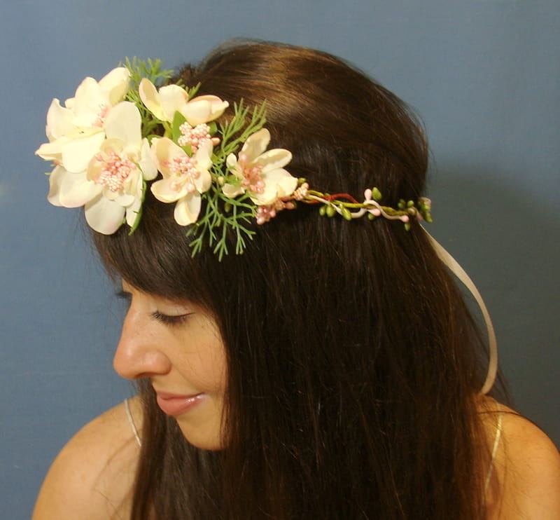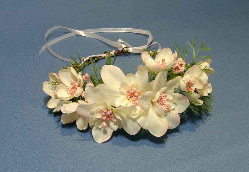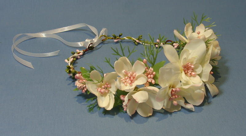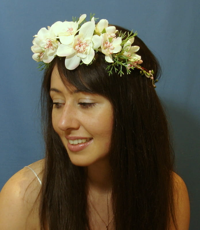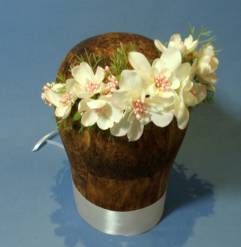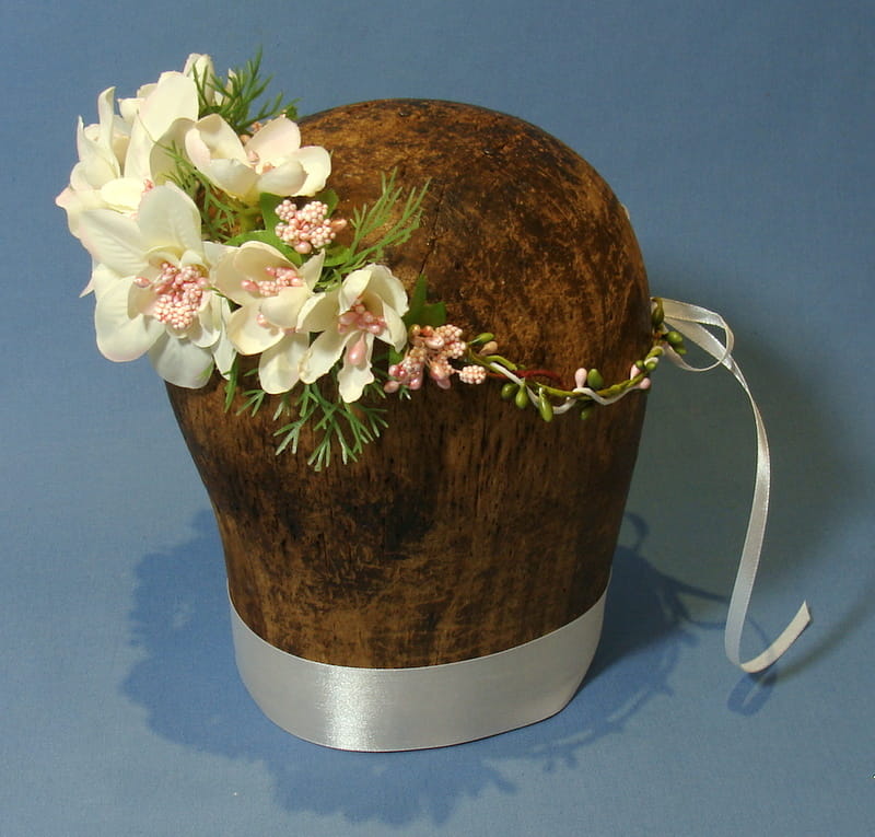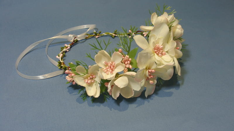 Wianek zdobiony kwiatami, które doskonale imitują żywe rośliny.