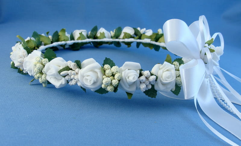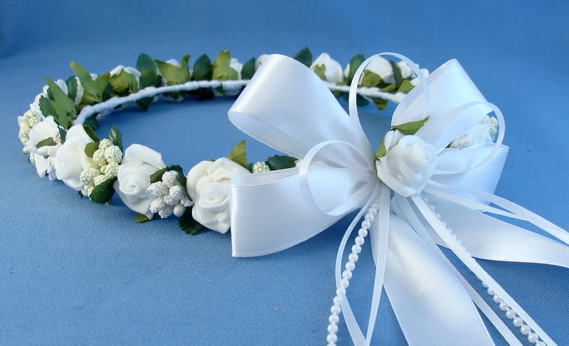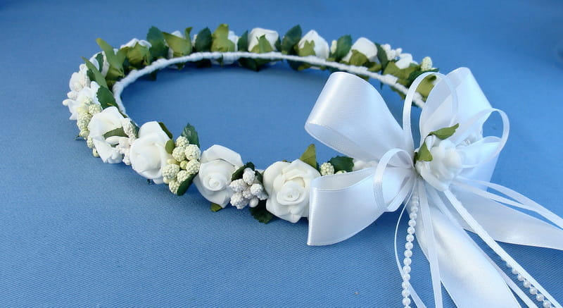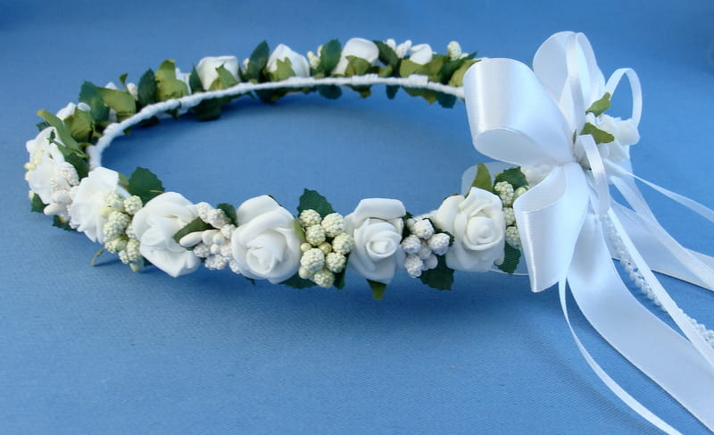 Tył wianka ozdabia biała , atłasowa kokarda , atłasowe tasiemki, perełki nanizane na sznureczek i komponująca się z całym wiankiem różyczka.