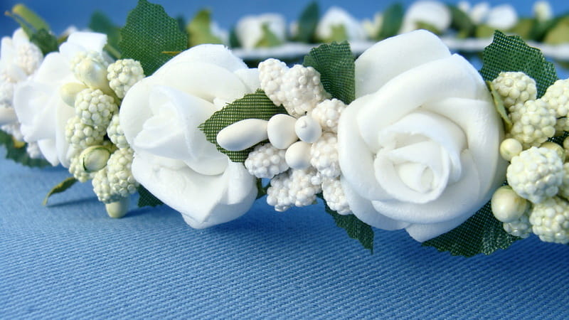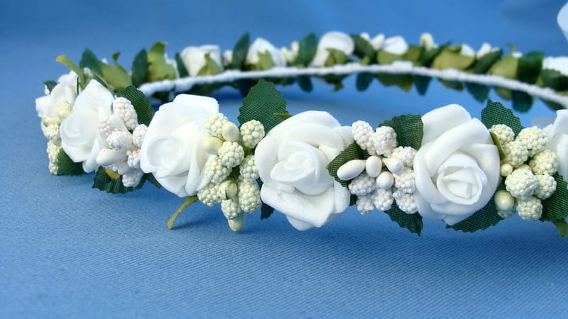 Wianek wykonany jest z białych różyczek piankowych typu mercedeska i białych i zielonych szyszeczek. Spod każdej różyczki wystają zielone listki.