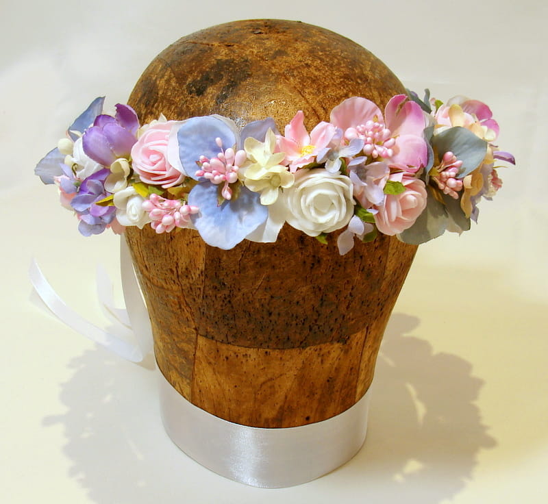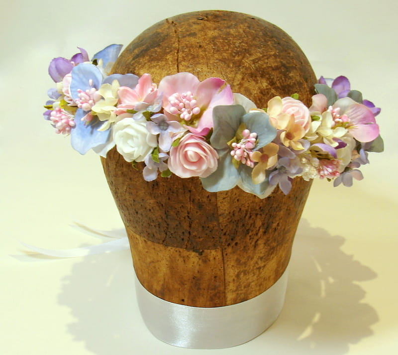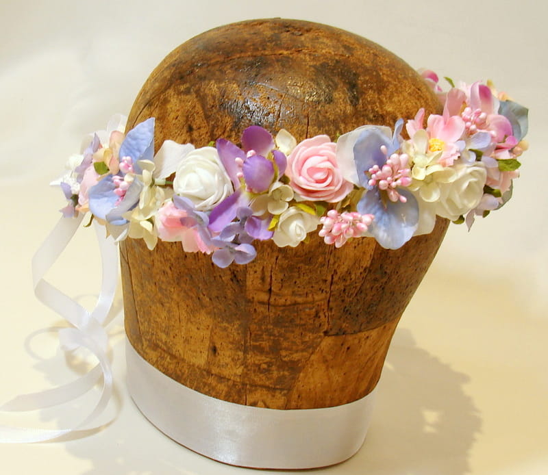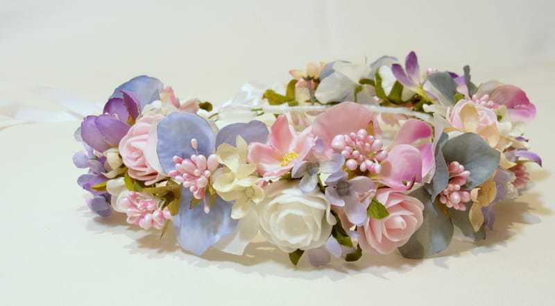 Uroczy ,pastelowy wianek zdobiony kwiatami,które doskonale imitują żywe rośliny.