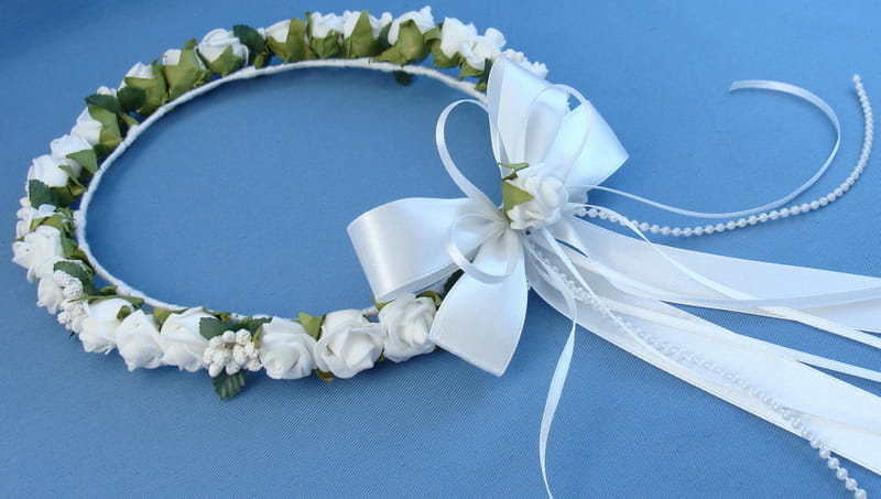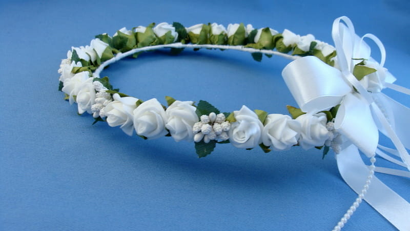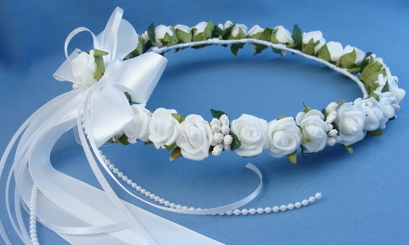 Tył wianka ozdabia biała , atłasowa kokarda , atłasowe tasiemki, perełki nanizane na sznureczek i komponująca sięz całym wiankiem różyczka.