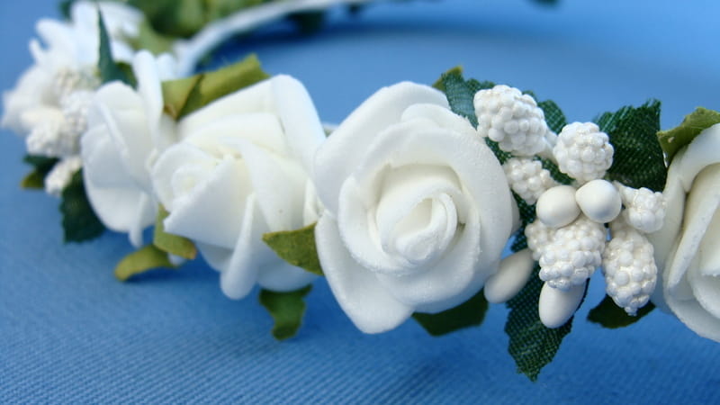 Wianek wykonany jest z białych różyczek piankowych typu mercedeska .Ozdobiony białymi szyszeczkami. Spod każdej różyczki wystają zielone listki.