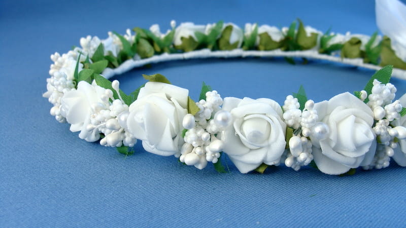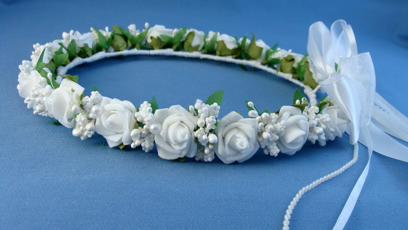 Wianek wykonany jest z białych różyczek piankowych typu mercedeska i białych szyszeczek. Spod każdej różyczki wystają zielone listki. Wianek ozdobiony jest perełkami.