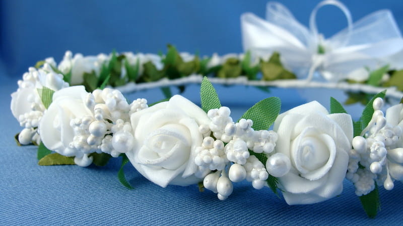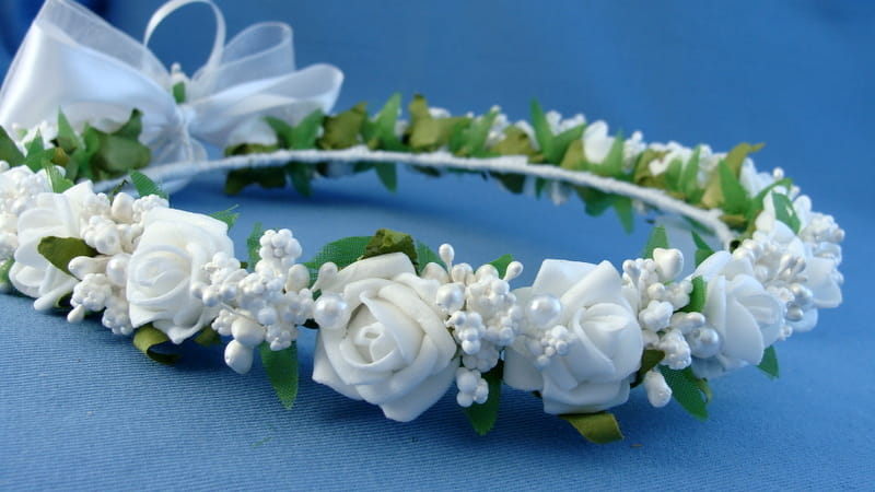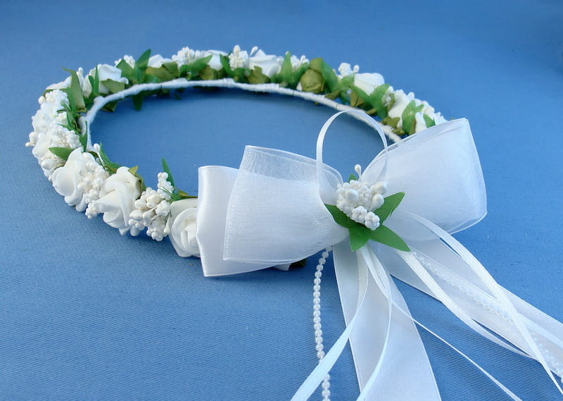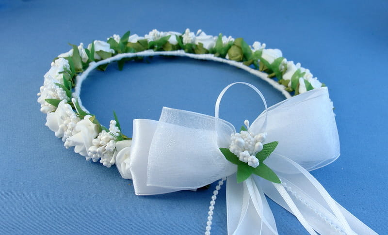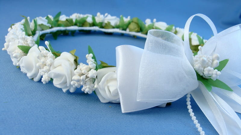 Tył wianka ozdabia biała , atłasow-szyfonowa kokarda , atłasowe tasiemki, perełki nanizane na sznureczek i komponująca się z całym wiankiem różyczka.