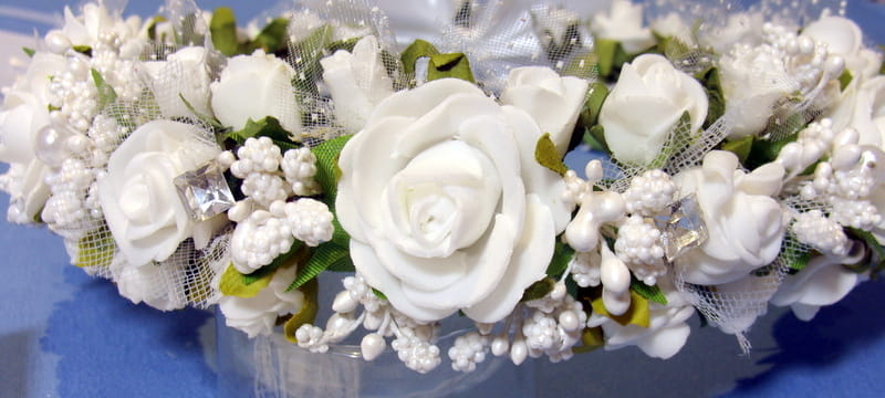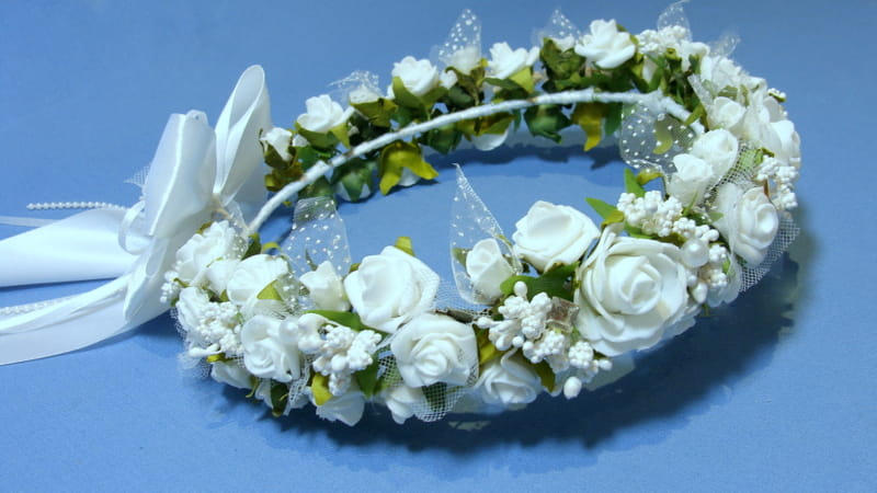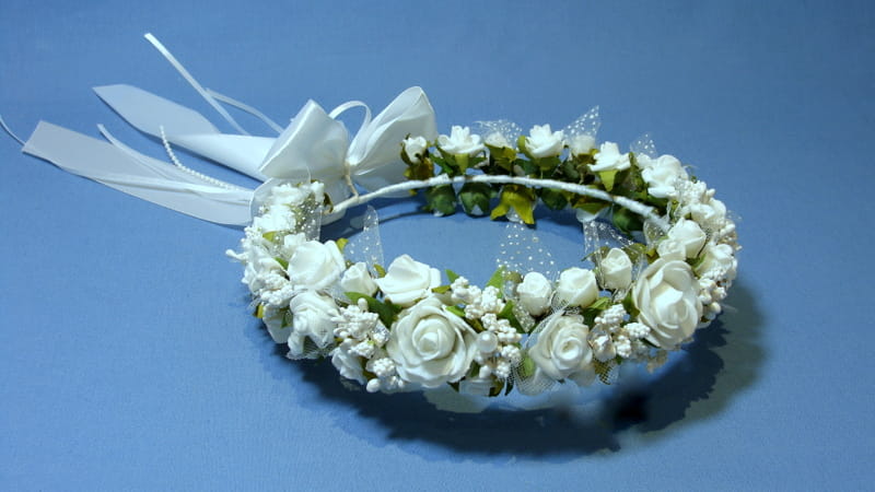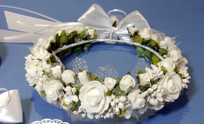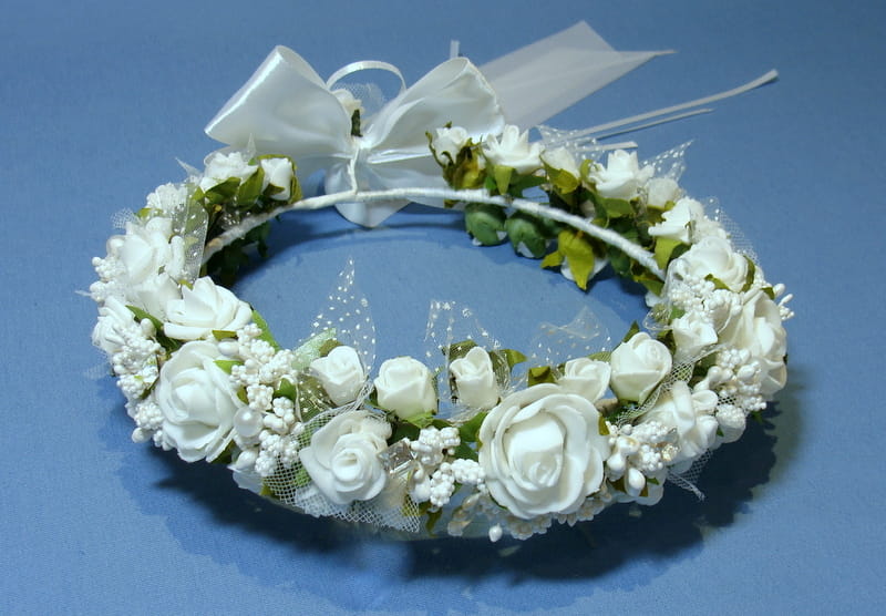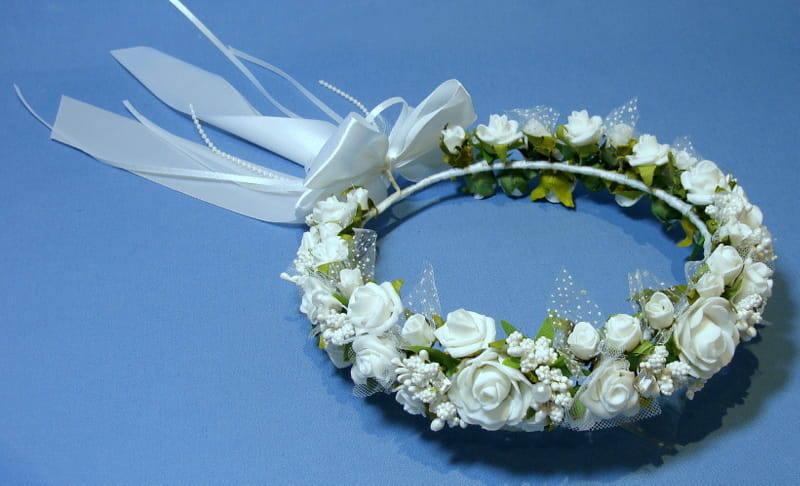 Piękny wianek spleciony z białych elementów. Część różyczek posiada tiulowe okółki i okółki z kropeczkami. Wianek zdobiony jest bogato szyszeczkami w kolorze białym , perłami i mieniącymi się brylantami.