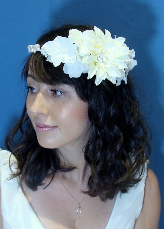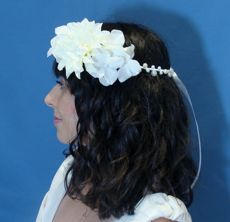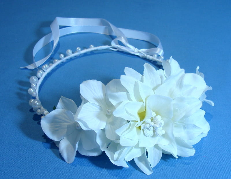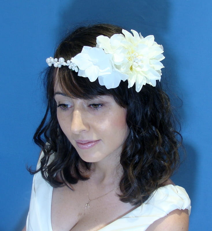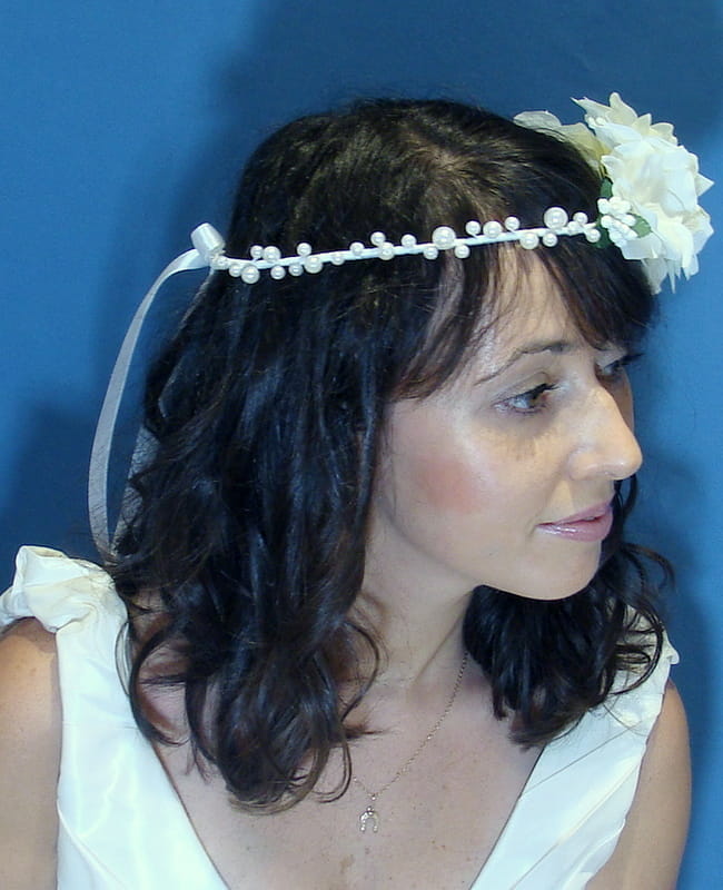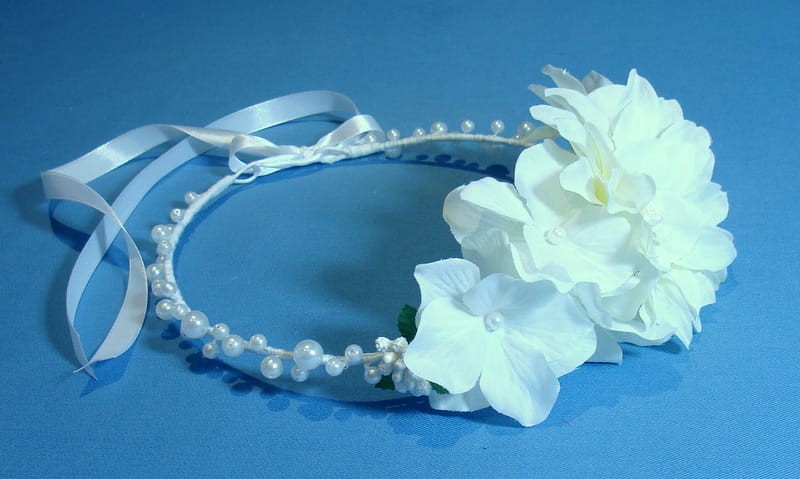 Wianek zdobiony perełkami oraz kwiatami, które doskonale imitują żywe rośliny.