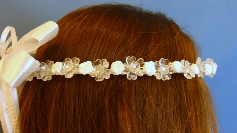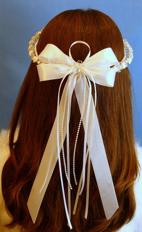 Tył wianka ozdabia biała , atłasowa kokarda , atłasowe tasiemki, perełki nanizane na sznureczek i komponujący się z całym wiankiem kryształowy kwiatek.
