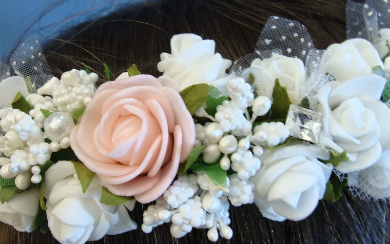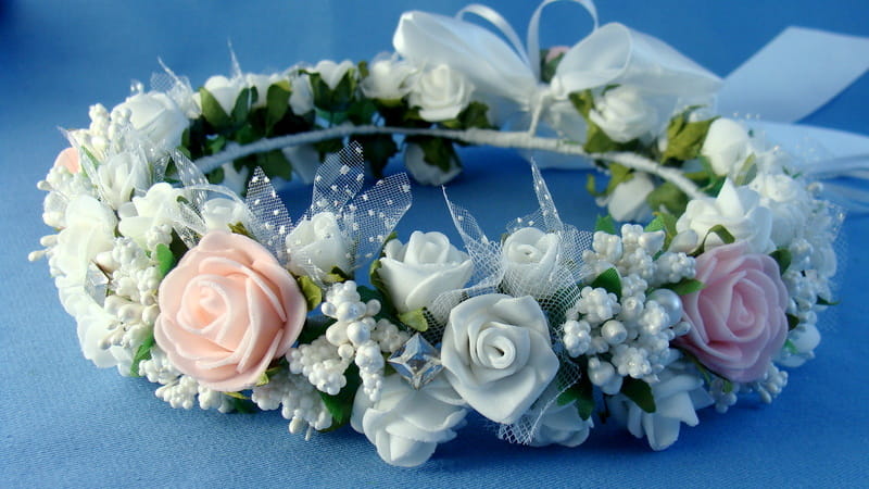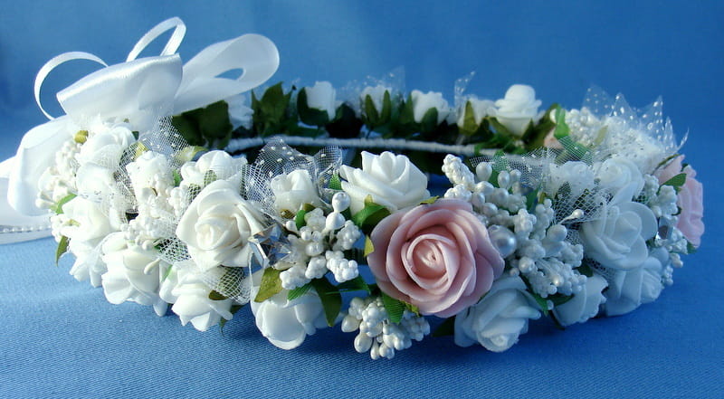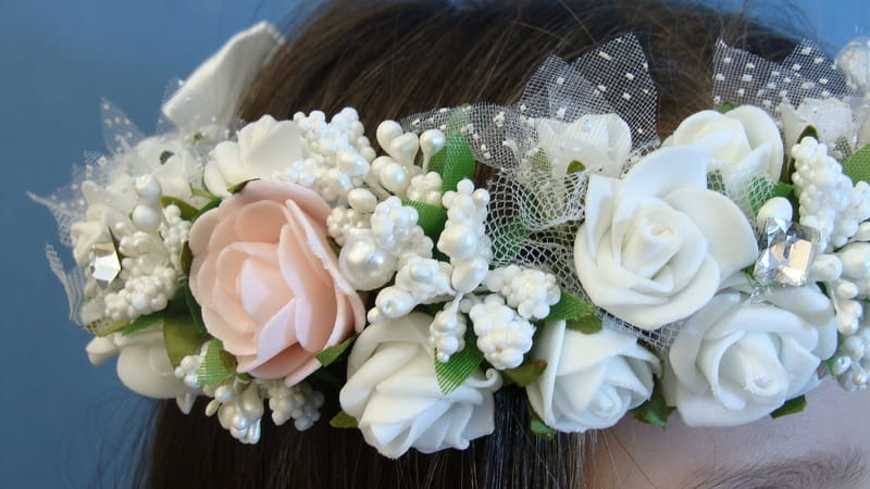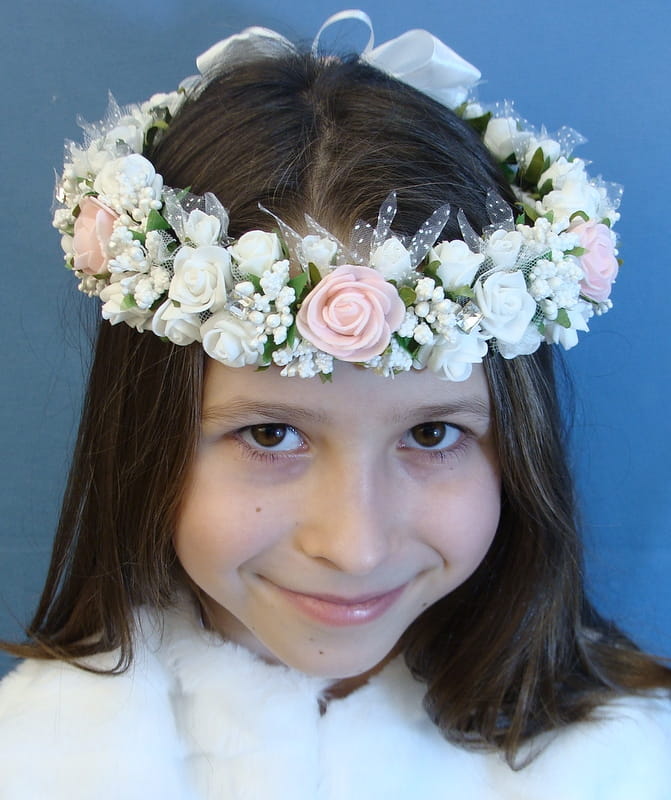 Piękny wianek spleciony z białych i różowych elementów. Różyczki białe dodatkowo posiadają tiulowe okółki. Wianek zdobiony jest licznymi szyszeczkami w kolorze białym , perłami i mieniącymi się brylantami.