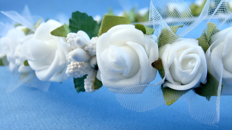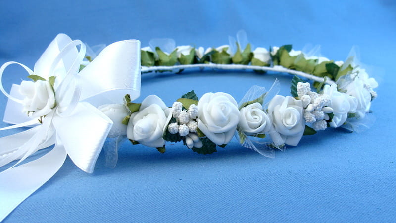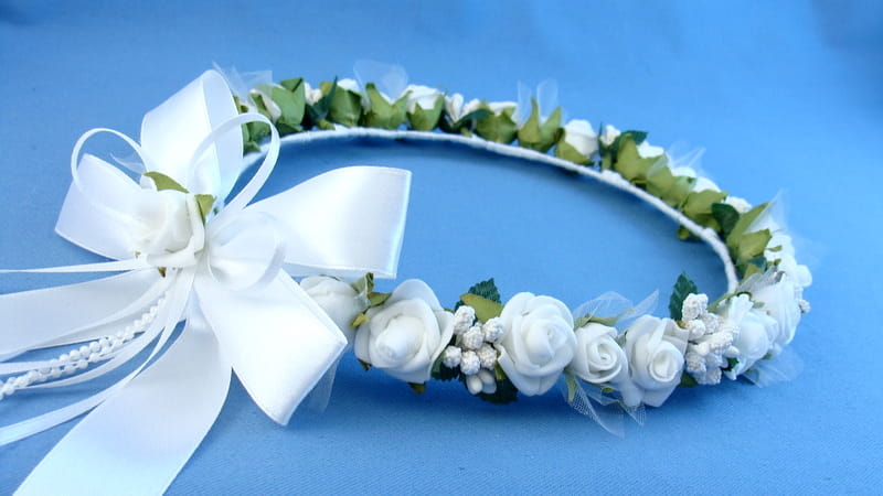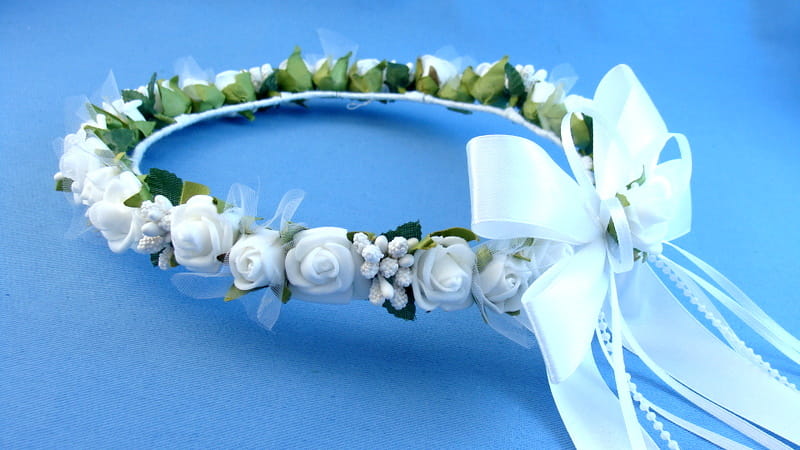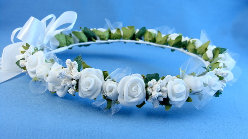 Tył wianka ozdabia biała , atłasowa kokarda , atłasowe tasiemki, perełki nanizane na sznureczek i komponująca się z całym wiankiem różyczka.