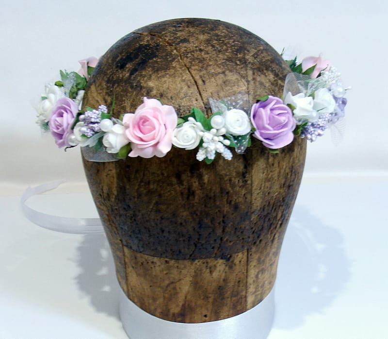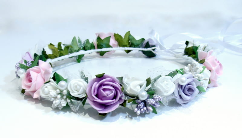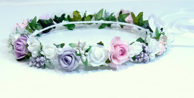 Wianek spleciony z białych, różowych i fioletowych różyczek piankowych, ozdobiony białymi i fioletowym szyszeczkami. Dodatkowo zdobiony perłami.