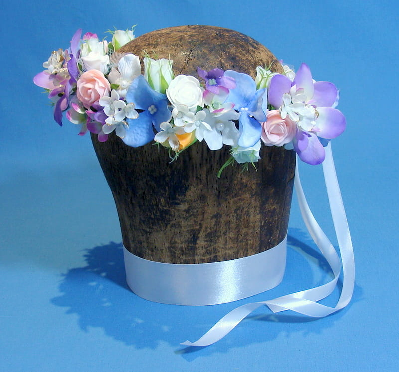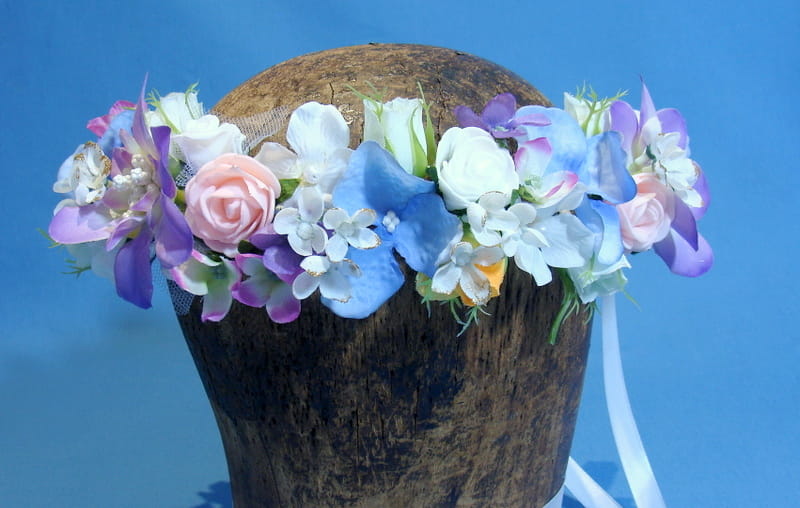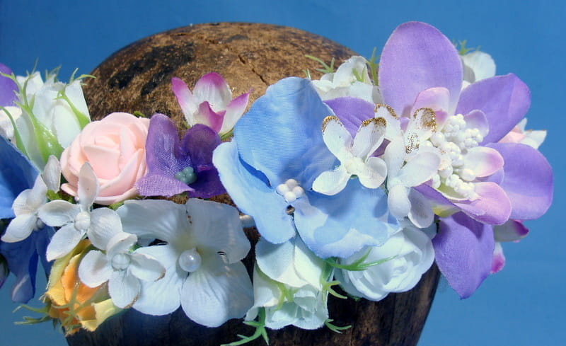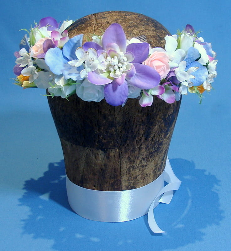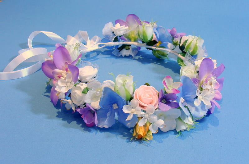 Wianek zdobiony kwiatami, które doskonale imitują żywe rośliny.