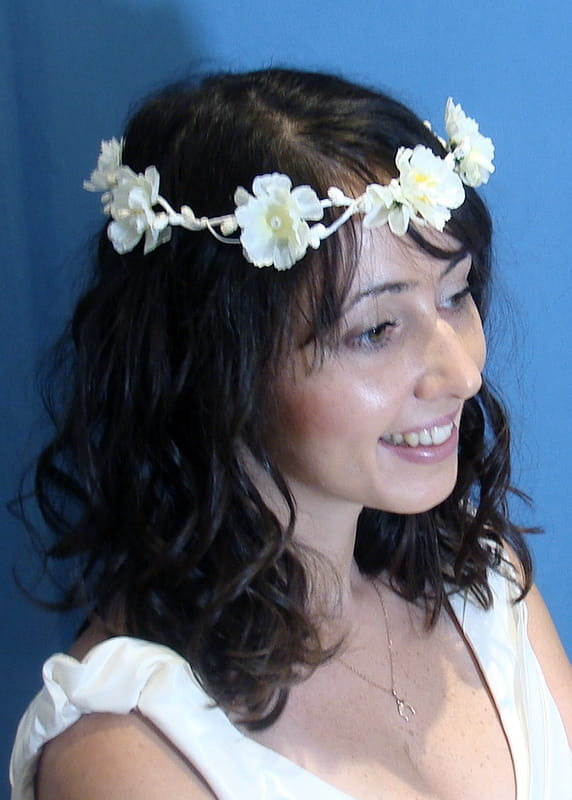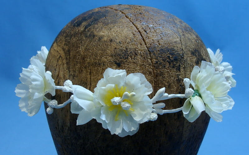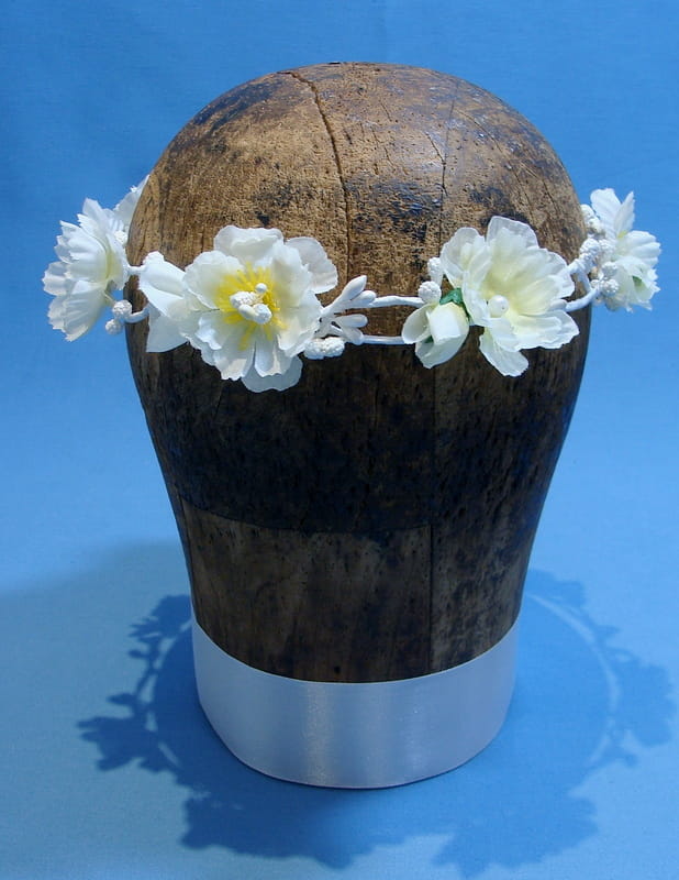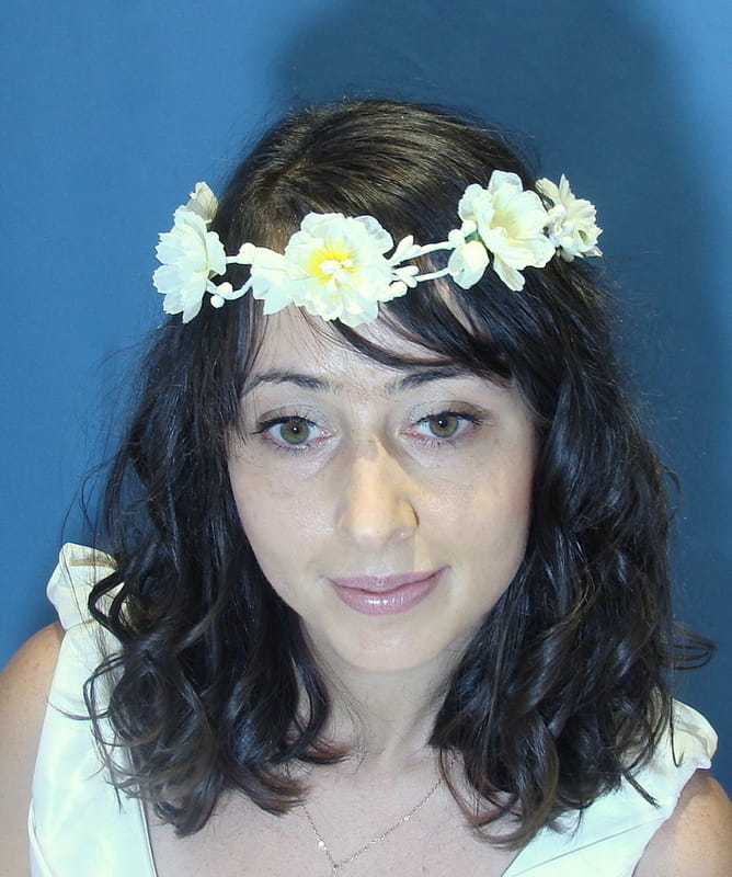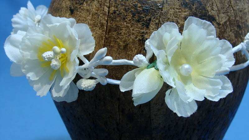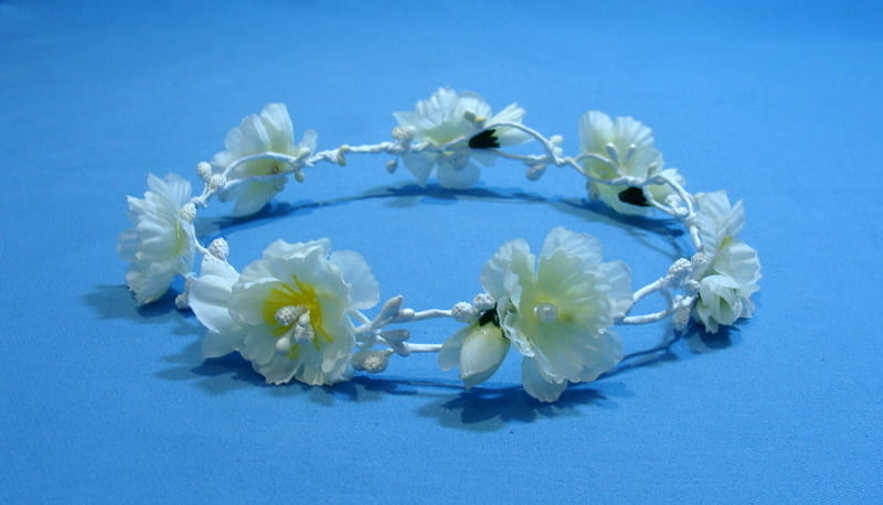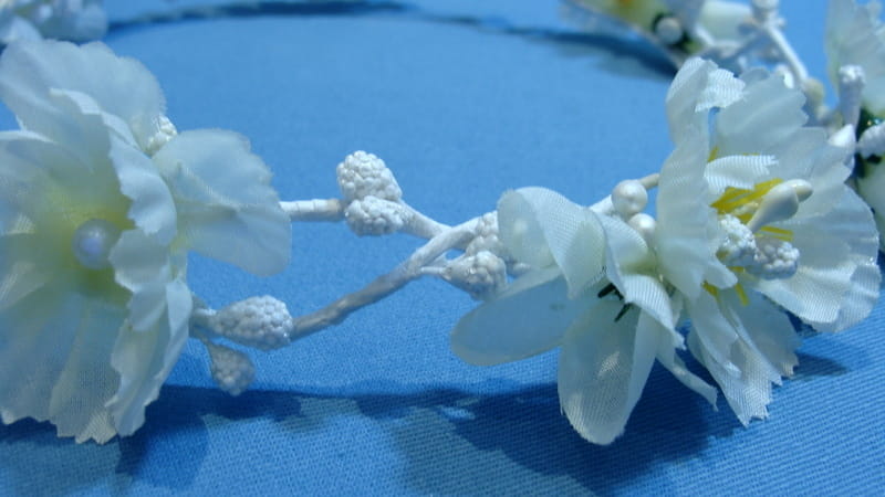 Wianek zdobiony kwiatami, które doskonale imitują żywe rośliny.