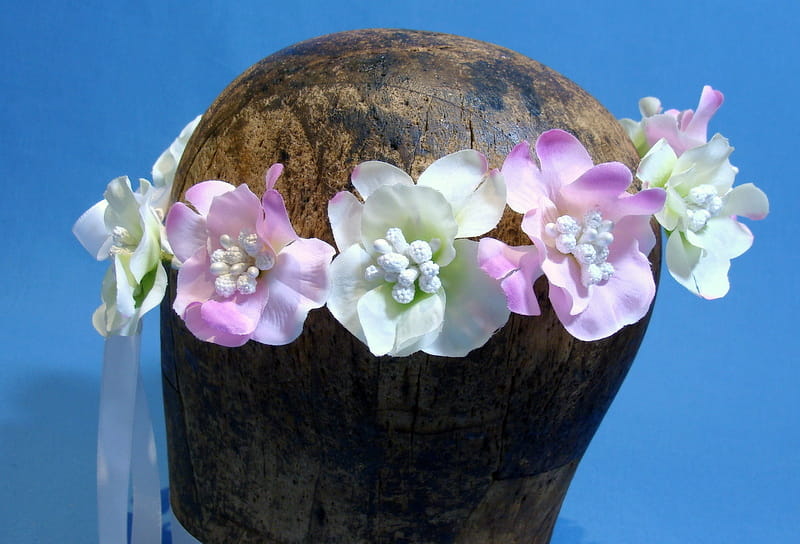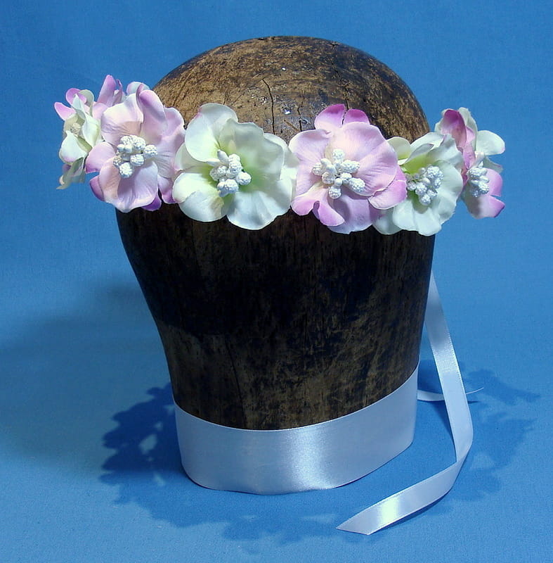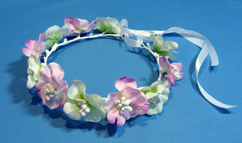 Wianek zdobiony kwiatami, które doskonale imitują żywe rośliny.