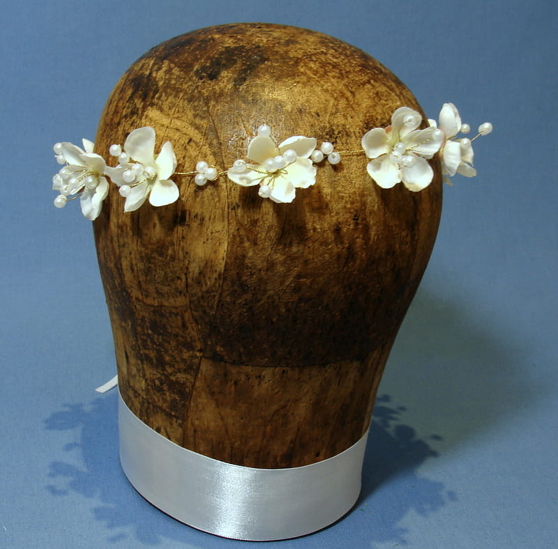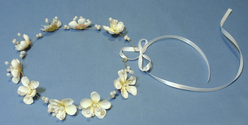 Bardzo delikatny i subtelny wianek wykonany na złotym druciku z kremowymi kwiatkami i perełkami.
