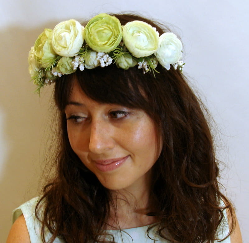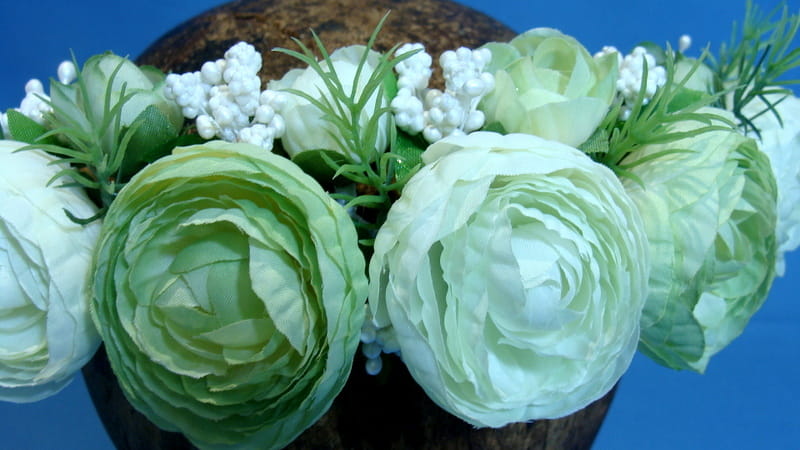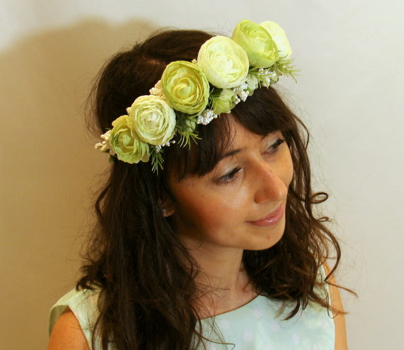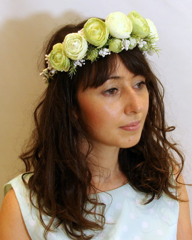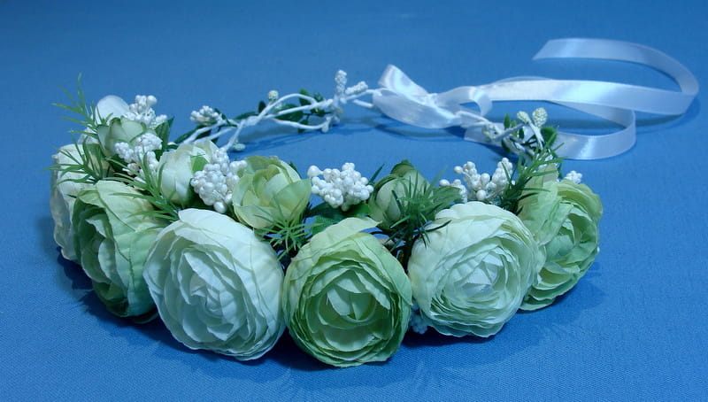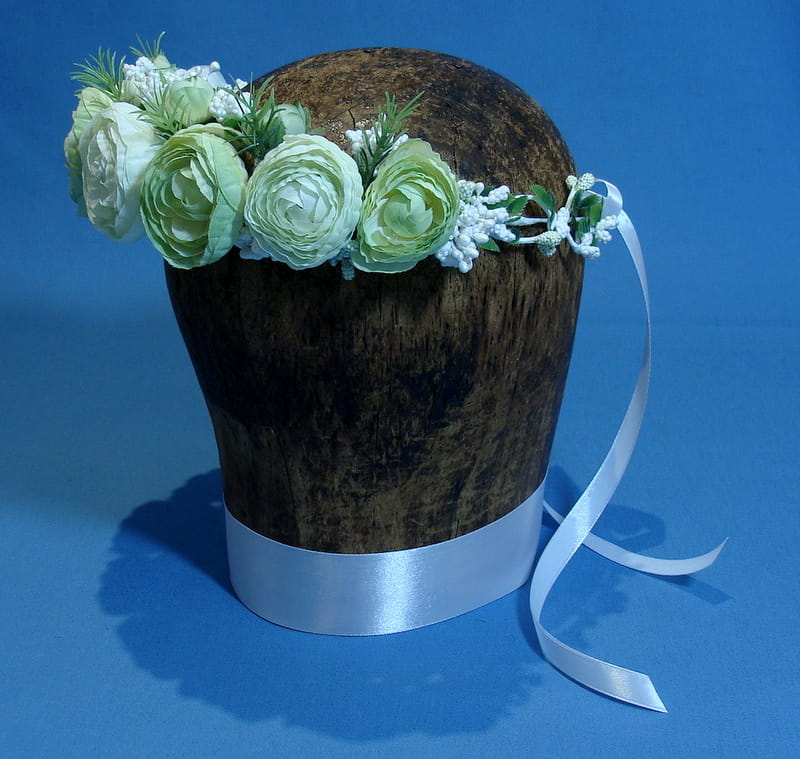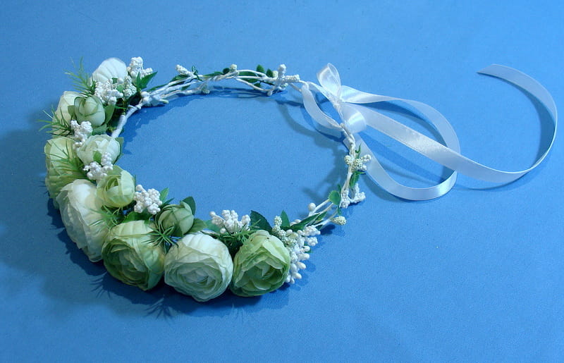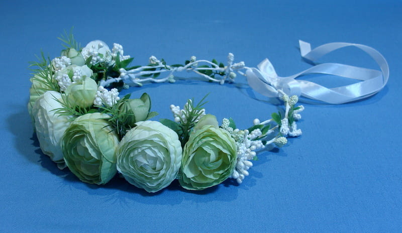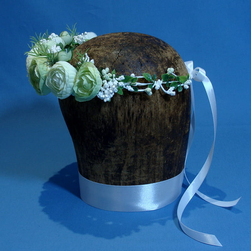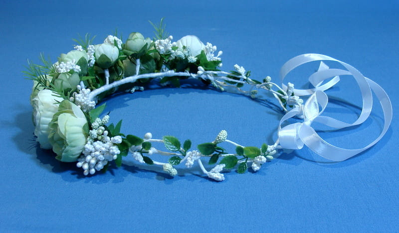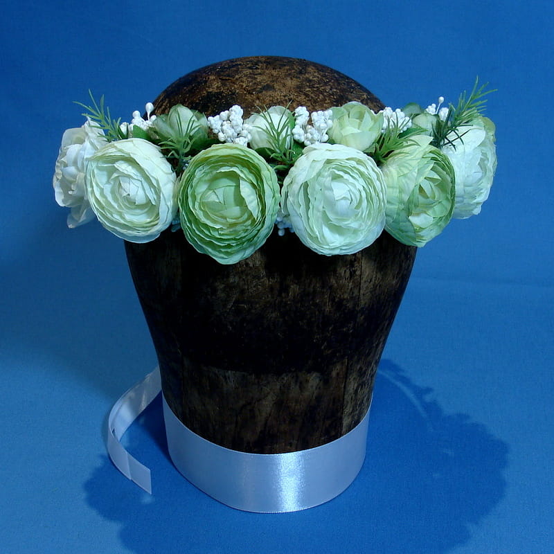 Wianek zdobiony kwiatami, które doskonale imitują żywe rośliny.