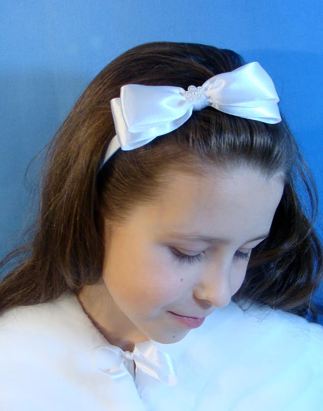 Głównym elementem ozdobnym opaski Zuzia jest piękna , umieszczona z boku atłasowa kokarda . Na środku kokardy znajduje się kwiatek z masy perłowej. .